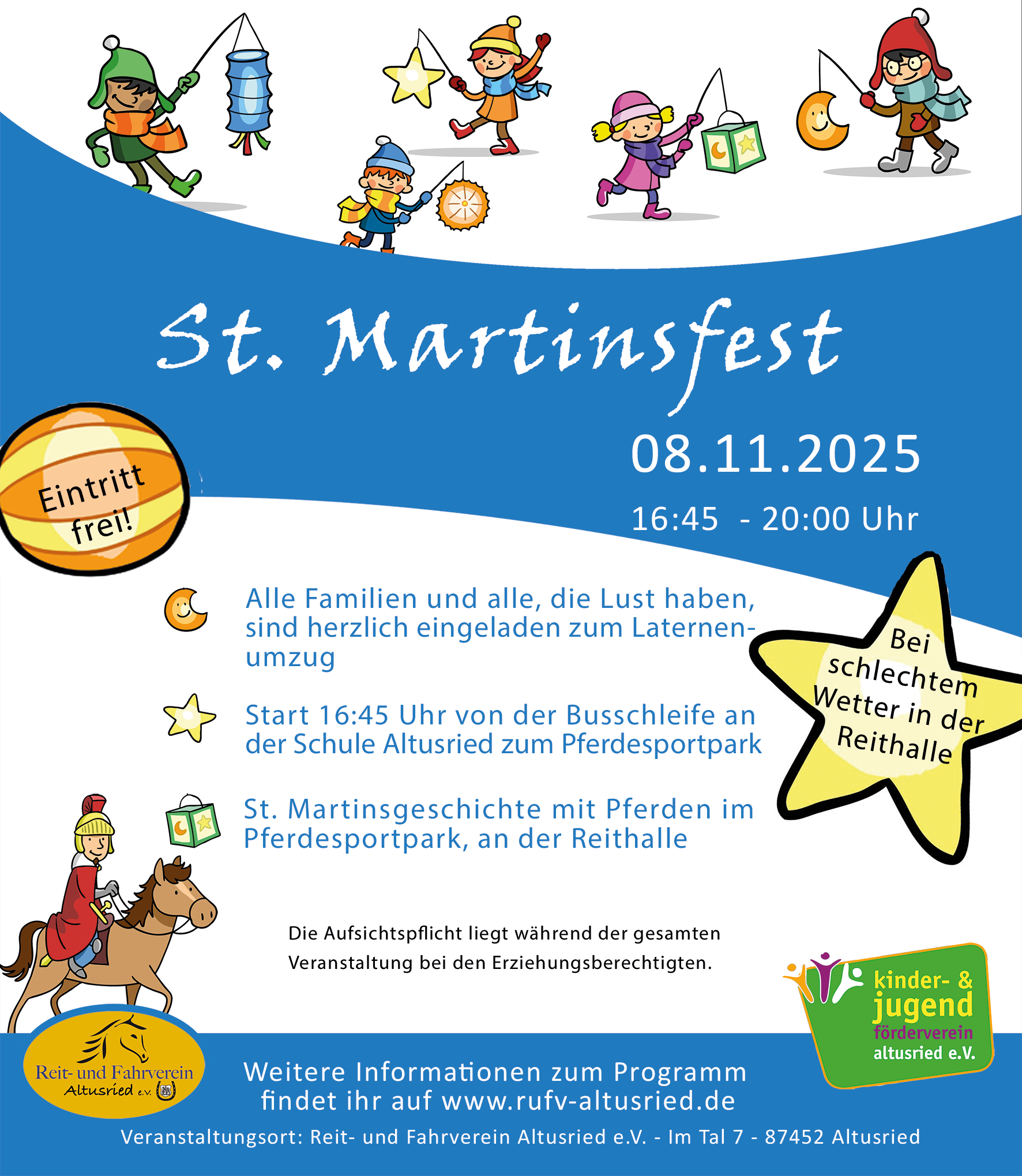 Dort erwartet euch ein buntes Programm: Einzug von Sankt Martin auf dem Pferd mit Gefolge, Getränke- und Essensstände des Kinder- und Jugendfördervereins sowie des Reitvereins. Bei schlechtem Wetter findet das gesamte Programm in der Reithalle statt.