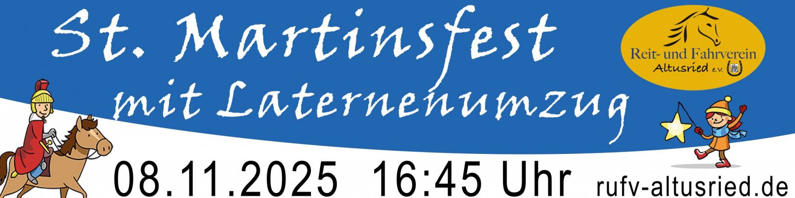 Dort erwartet euch ein buntes Programm: Einzug von Sankt Martin auf dem Pferd mit Gefolge, Getränke- und Essensstände des Kinder- und Jugendfördervereins sowie des Reitvereins. Bei schlechtem Wetter findet das gesamte Programm in der Reithalle statt.